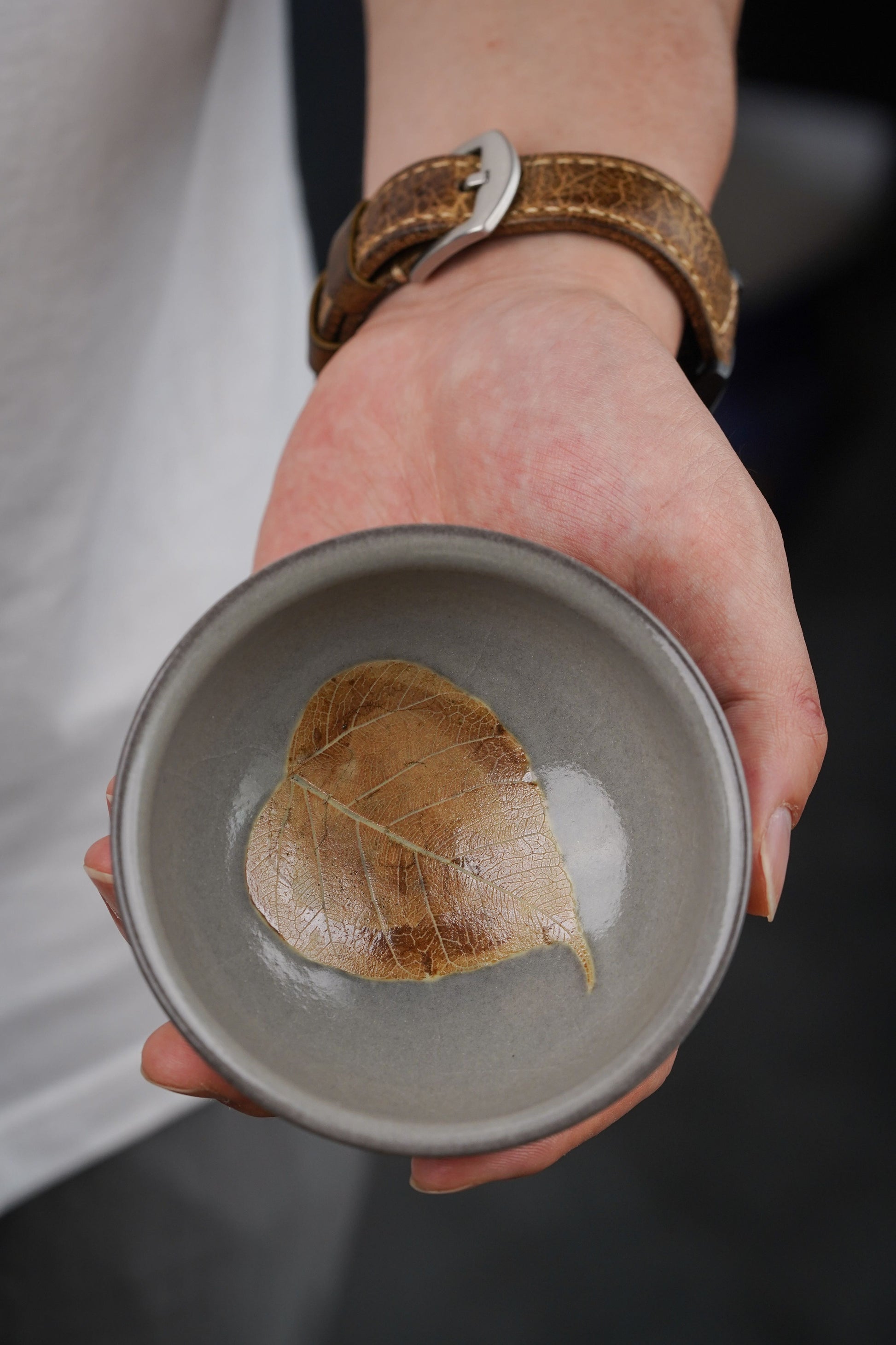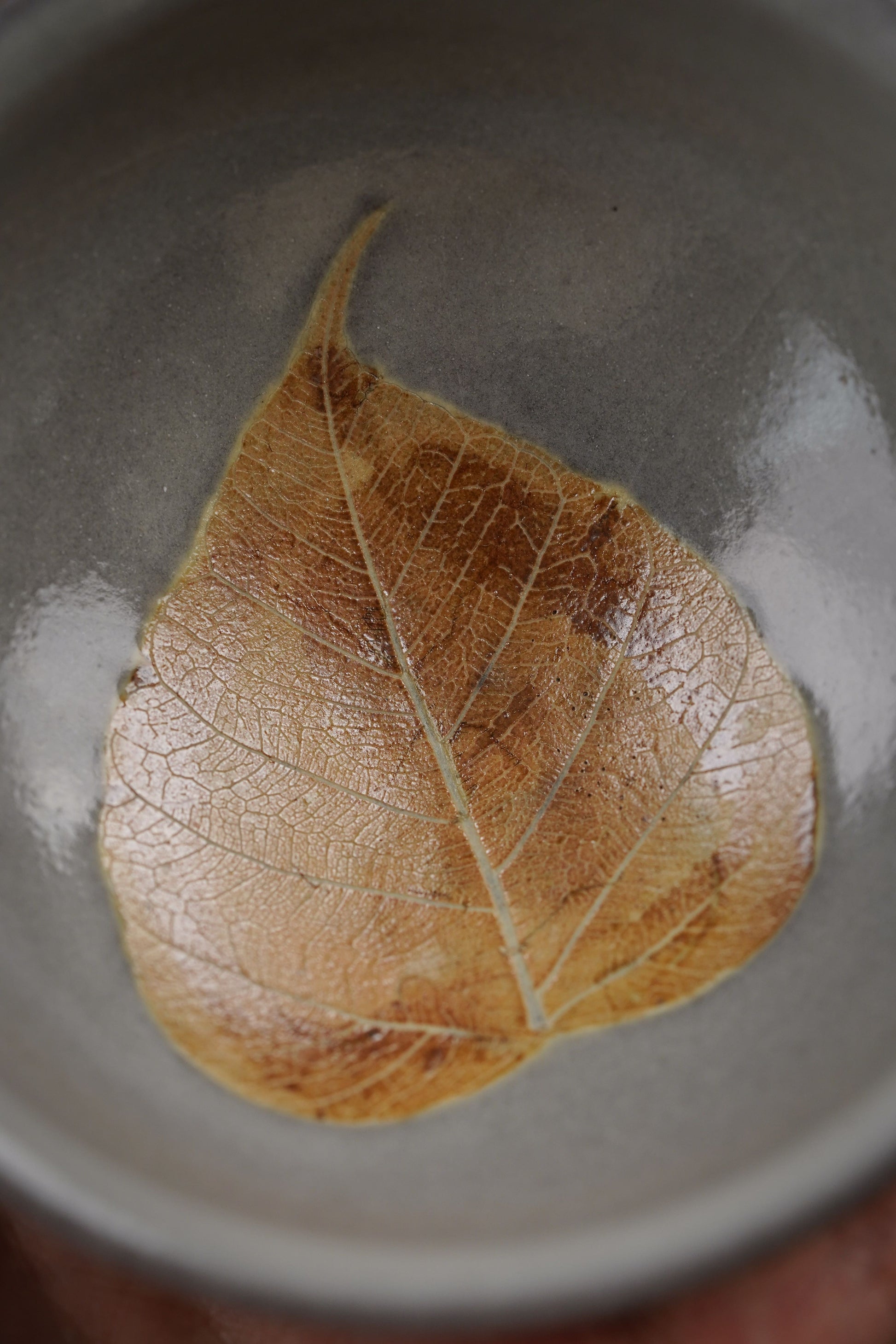 Each leaf is made with bodhi leaf from Yuan nan, and the leaf is crystallized on the surface of the glaze during firing. This is an extremely complicated technic. The success rate is even lower than the regular wood-fired pieces, making it a perfect piece for collection.